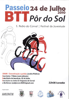 Já se encontram abertas as inscrições para o Passeio de BTT Pôr do Sol a realizar em S. Pedro do Corval no próximo dia 24 de Julho. As inscrições podem ser feitas junto de qualquer membro da Amijovem ou da Secção de BTT da Casa de Cultura de Corval ou para o mail amijovem.2009@gmail.com  e estão abertas até ao próximo dia 22 de Julho. Mais informações em http://docs.google.com/Doc?docid=0AQ_oLH69H0OSZGd2aHB4NmdfMzJtNjlraHBoag&hl=en
